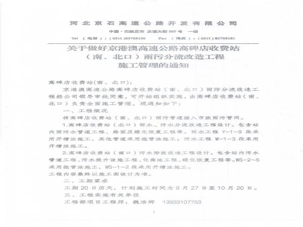 關于做好京港澳高速公路高碑店收費站(南、北口)雨污分流改造工程施工管理的通知