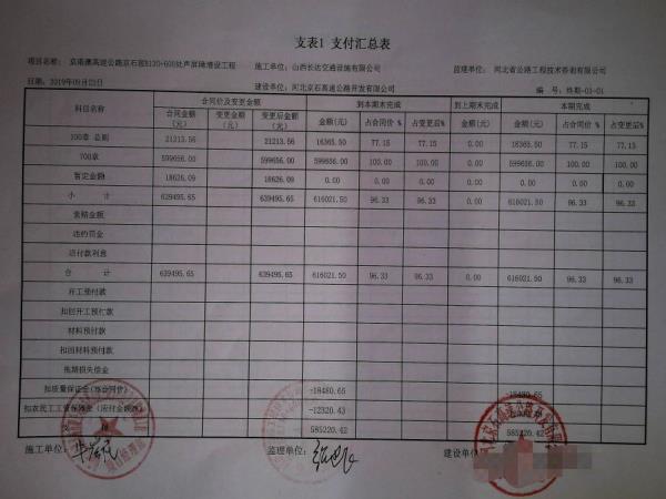 京港澳高速公路京石段K130+600處聲屏障增設(shè)工程支付證書