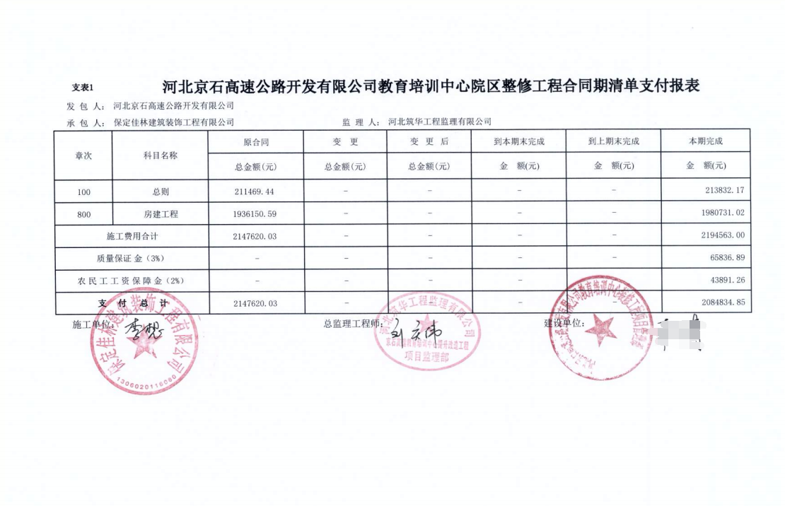 河北京石高速公路開發(fā)有限公司教育培訓中心院區(qū)整修工程工程款支付