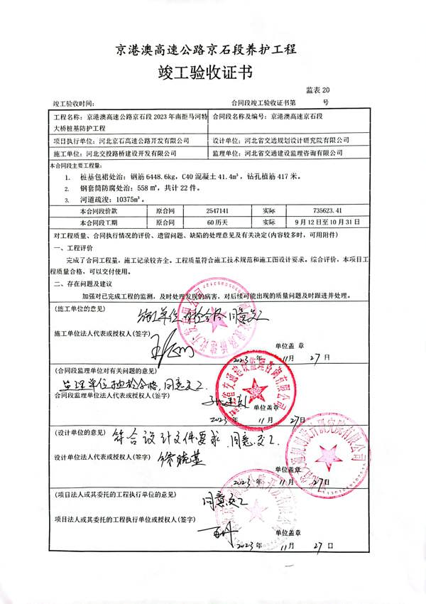 京港澳高速公路京石段2023年南拒馬河特大橋樁基防護(hù)工程驗(yàn)收證書