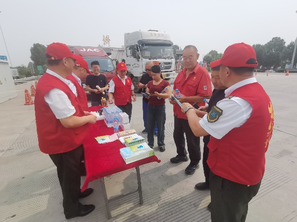 9時(shí)許,志愿者們身著紅馬甲、佩戴黨徽在站口集結(jié)?,F(xiàn)場設(shè)立 “暖心服務(wù)臺(tái)”,為司乘提供免費(fèi)飲用水、道路指引及路況咨詢,同步發(fā)放安全出行指南;對持有《聯(lián)合收割機(jī)跨區(qū)作業(yè)證》的車輛開通“綠色通道”,實(shí)行“優(yōu)先查驗(yàn)、快速放行”;黨員志愿者分組開展站口廣場及周邊環(huán)境清掃,維護(hù)整潔通行環(huán)境;聯(lián)合文旅部門推出文旅套餐,包含劉伶醉景區(qū)門票、觀影優(yōu)惠券、公益音樂會(huì)海報(bào)等。據(jù)統(tǒng)計(jì),活動(dòng)累計(jì)服務(wù)車輛50余輛,服務(wù)司乘80余人次,發(fā)放宣傳資料150余份,以“黨建+志愿服務(wù)”模式為端午出行保駕護(hù)航。
