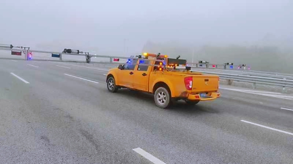 京石高速智調(diào)中心發(fā)布了大霧黃色風(fēng)險預(yù)警,并下達(dá)了壓車帶道的準(zhǔn)備工作指令。定興養(yǎng)護(hù)工區(qū)接到指令后,立即在工作微信群中發(fā)布了預(yù)警信息,并做好了人員、車輛、設(shè)施設(shè)備的準(zhǔn)備工作。經(jīng)過路警會商,從健康城開始執(zhí)行壓車帶道任務(wù)。定興工區(qū)的帶道車展開“雙翼”居中,與路警車輛組成壓車隊,“一”字形橫向排布在各條車道上,以40公里/時的速度帶領(lǐng)車隊安全通過霧區(qū),直至清苑收費站,行駛里程近110公里,壓車帶道任務(wù)順利完成。全程通過車載揚聲器進(jìn)行安全警示,提醒社會車輛注意行車安全。壓車帶道舉措顯著提升了司乘人員的通行體驗,有效減輕了道路安全壓力,為公眾出行創(chuàng)造了更加順暢、安全的交通環(huán)境。