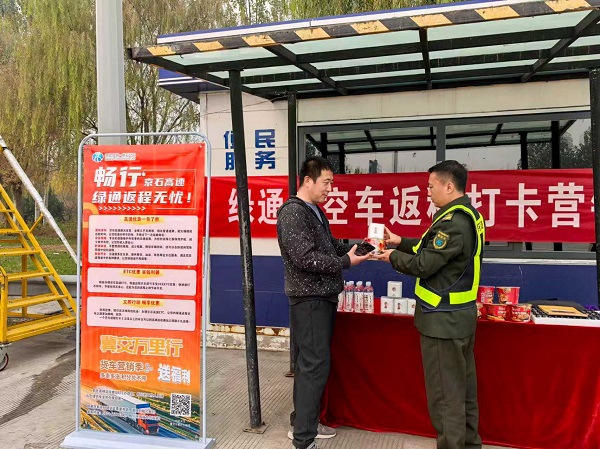 為積極響應(yīng)公司“一站一特色”引流活動(dòng)號(hào)召,加速推進(jìn)“空車配載”專項(xiàng)工作,高碑店收費(fèi)站作為綠通運(yùn)輸樞紐大站,于11月5日在站口開展“綠通車空車返程打卡營(yíng)銷”活動(dòng),以“看得見的實(shí)惠”精準(zhǔn)吸引綠通返程空車選擇高速公路,全力沖刺年度目標(biāo)任務(wù)。