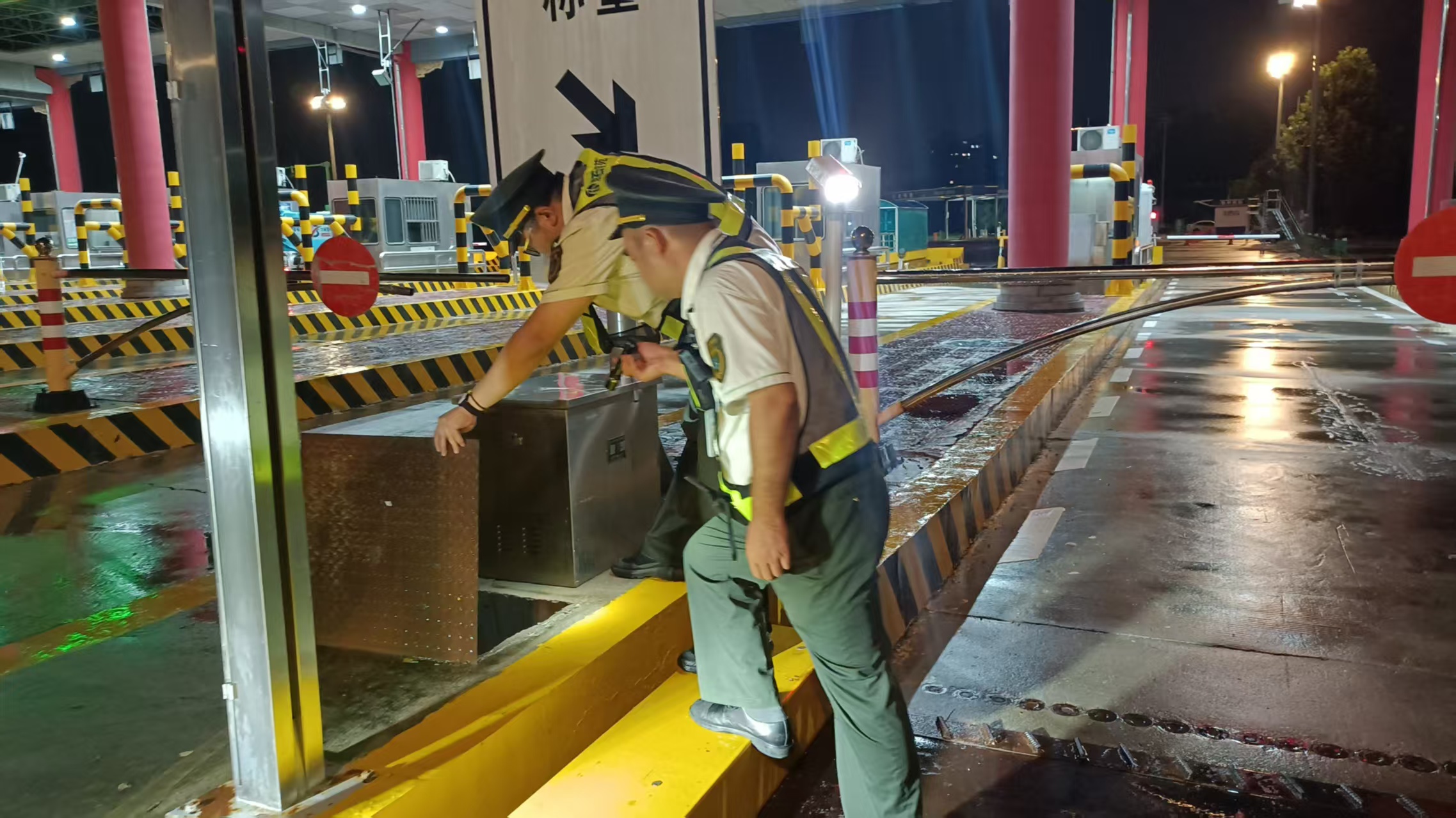 22時左右,雨勢開始逐漸減弱,于亮與疏導(dǎo)人員溫晨迅速走向雨幕,率先開展防汛應(yīng)急巡檢。他們逐一排查排水邊溝是否通暢、機電供電是否穩(wěn)定、計重設(shè)備是否正常運行,不放過任何一處風險點。